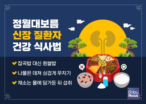 또한 나트륨과 당분의 섭취도 최대한 자제하는 것이 필요하다. 나트륨을 일반인들과 같은 양으로 섭취하면 혈압이 상승하고 신장 기능이 더 나빠질 수 있다. 정월대보름에 먹는 나물도 무칠 때 소금, 간장 등 염분이 많이 들어간 양념을 사용하기 때문에 되도록 싱겁게 조리한다. 나물에는 칼륨 성분이 많이 함유돼 있는데, 칼륨은 수용성이므로 조리 전 2시간 정도 미리 물에 담가둔 뒤 건져내 삶거나 데쳐 무치면 좋다. 채소는 칼륨 함량이 적은 배추, 오이, 콩나물 등을 대체해 먹는 것도 좋다.