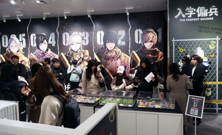 지난 11일 오후 3시 일본 도쿄도 시부야구. 일본 도쿄의 번화가 중에서도 중심인 시부야에 인파가 몰렸다. 일본에서 흥행 돌풍을 일으키고 있는 네이버웹툰 ‘입학용병’의 팝업스토어 때문이다. ‘라인 프렌즈 스퀘어 시부야’ 한켠에 마련된 팝업스토어는 초입부터 심상찮았다. 비행기 추락 사고에서 유일하게 생존한 주인공이 고도의 전투 능력을 키워 용병으로 살아간다는 웹툰의 세계관을 반영이라도 하듯, 팝업스토어로 내려가는 계단에서부터 전쟁터의 느낌이 물씬 풍겼다.