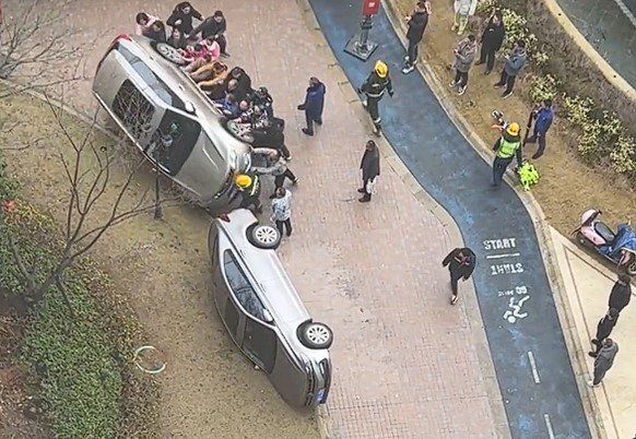 이를 보던 주민들은 차량을 밀어 옆을 눕혔다. 중국 SNS에 올라온 영상을 보면 앞쪽에 주차된 차량은 이미 뒤집힌 상태다. 이어 주민들은 뒤쪽에 있는 차량도 옆으로 눕혔다.