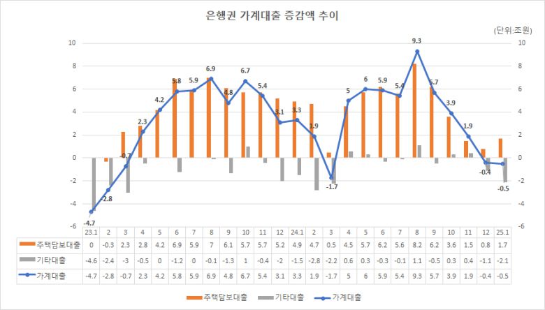 전(全) 금융권의 가계대출이 감소세로 돌아섰다. 부동산 경기 침체가 지속되면서 주택담보대출을 받는 사람이 줄어든 영향이다. 연초 상여금과 설 명절 상여금까지 더해지면서 신용대출을 포함한 기타 대출도 2조원가량 줄었다.
