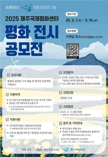 12일 제주도에 따르면 이번 2025 평화 전시 공모전은 제주의 평화 가치를 확산하고 도민과 문화예술계가 참여해 평화 이미지를 구현하는 것을 목적으로 기획됐다.