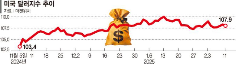 주요 6개 통화 대비 달러 가치를 계산하는 달러지수는 미국 대선이 열린 지난해 11월 5일(현지시간) 103.4에서 지난달 13일 109.9까지 오른 뒤 꺾여 11일 기준 107.9에 머물고 있다. 가상자산의 대표주자인 비트코인 가격도 같은 기간 개당 6만9391달러에서 지난달 21일 10만6188달러까지 올랐다가 11일 9만5827달러(약 1억3924만원)를 기록했다. 미국 스탠더드앤드푸어스(S&P)500지수는 대선 당일 5782.76에서 지난달 23일 6118.71까지 오르더니 11일 6068.5에 장을 마쳤다. 특히 트럼프 2기 정부에서 정부효율부 수장으로 임명된 일론 머스크가 경영하는 테슬라의 주가는 같은 기간 주당 251.44달러에서 지난해 12월 17일 479.86달러까지 뛰었다가 11일 328.5달러로 내려갔다.