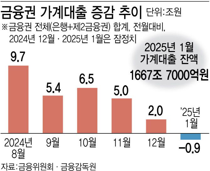 금융당국은 “안심할 상황은 아니다”고 했다. 금융위 관계자는 “본격적인 영업 개시와 신학기 이사 수요 등으로 2월부터는 가계대출이 증가세로 전환할 가능성이 크다”며 “가계대출의 안정적 관리를 위해 주택시장·금리 동향을 지속적으로 모니터링 할 필요가 있다”고 했다. 정책 대출도 꾸준히 증가하고 있다.