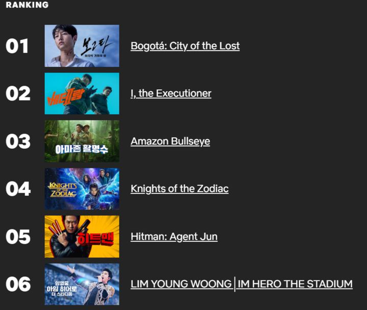 1위는 '보고타 2위는 베테랑2, 3위는 아마존 활명수, 4위는 'Knights of the Zodiac', 5위는 히트맨 1편이다.