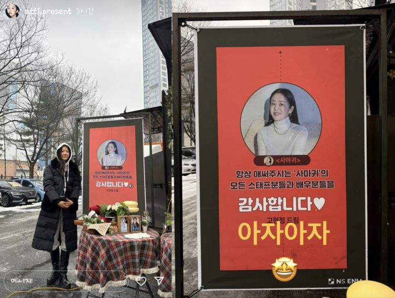 간식차 플래카드에는 “항상 애써주시는 ‘사마귀 모든 스태프분과 배우분들 감사합니다. 고현정 드림”, “이신이가 ’사마귀‘ 팀을 위해 준비한 커피차 도착. 여러분을 위해 준비한 따뜻한 커피 오늘 촬영도 화이팅” 등의 응원 메시지가 적혀 있다.