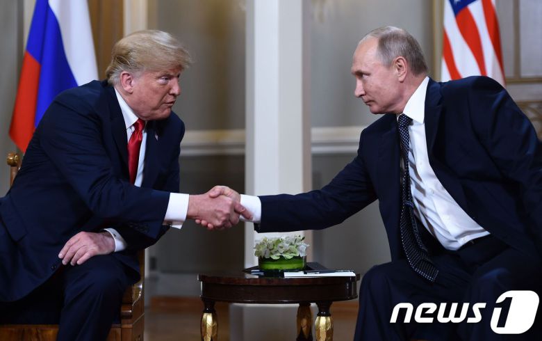 도널드 트럼프 미국 대통령과 블라디미르 푸틴 러시아 대통령이 2018년 7월 16일(현지시간) 핀란드 헬싱키의 대통령 궁에서 정상회담을 시작하며 악수하고 있다.ⓒ AFP=뉴스1 ⓒ News1 우동명 기자 |