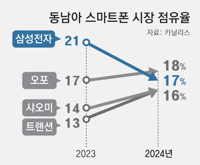 동남아에서 삼성전자 스마트폰의 점유율은 2023년 초까지 압도적 1위였다. 지난해부터 시장 상황이 급격히 바뀌어 4분기(10∼12월) 4위로 떨어지며 1∼3위를 오포, 샤오미, 트랜션 등 중국 업체에 내줬다.