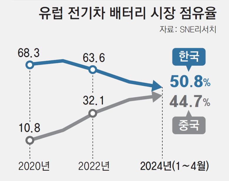 이는 유럽 시장을 텃밭으로 두고 있던 한국 업체들의 점유율 하락으로 이어지고 있다. 글로벌 시장조사업체 SNE리서치에 따르면 유럽 시장에서 한국 배터리 기업의 점유율은 2020년 68.3%에서 지난해 4월 기준 50.8%로 떨어진 것으로 집계됐다. 같은 기간 중국 배터리 점유율은 10.8%에서 44.7%까지 올랐다.