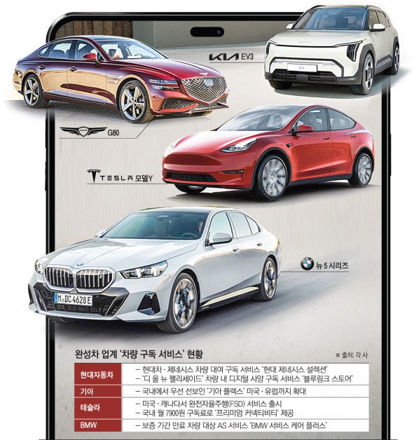 12일 완성차 업계에 따르면 최근 현대자동차그룹을 비롯해 테슬라, BMW는 차량 구독 서비스를 확장하거나, 자동차 내 특정 서비스를 구독할 수 있는 서비스를 선보이고 있다. 차량 구독 서비스는 고객들이 가입비나 선납금 없이 월 구독료와 주유비, 세차비 등 일상 지출만 부담하면 되는 구조다. 또 구독한 차량의 주행거리 제한도 없어 렌탈이나 리스 상품과도 차별성을 보인다.