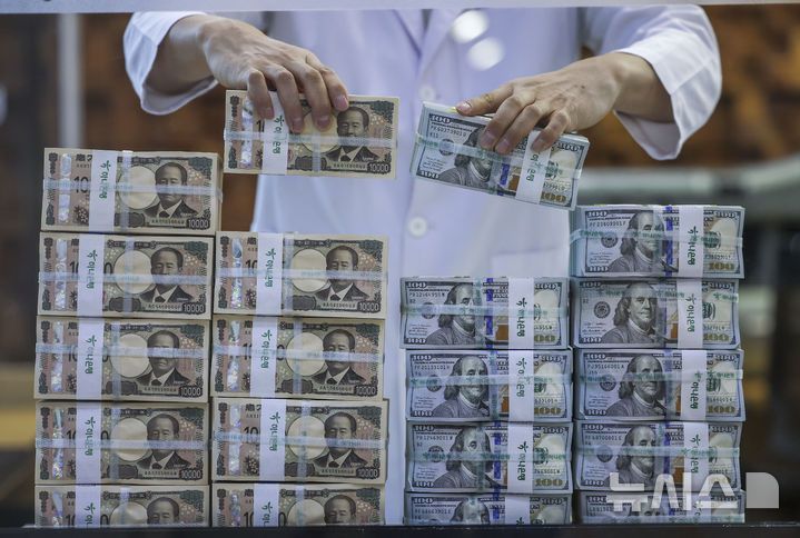 [서울=뉴시스] 정병혁 기자 = 18일 서울 중구 하나은행 위변조대응센터에서 직원이 엔화와 달러화를 정리하고 있다.엔·달러 환율이 약 2개월 반만에 1달러당 150엔선을 넘었다. 엔화는 17일(현지시간) 뉴욕 외환시장에서 1달러당 150.2엔 수준까지 올랐다. 엔화 가치가 1달러당 150엔선으로 떨어진 것은 지난 8월 이후 약 2개월 반만이다. 2024.10.18. jhope@newsis.com |