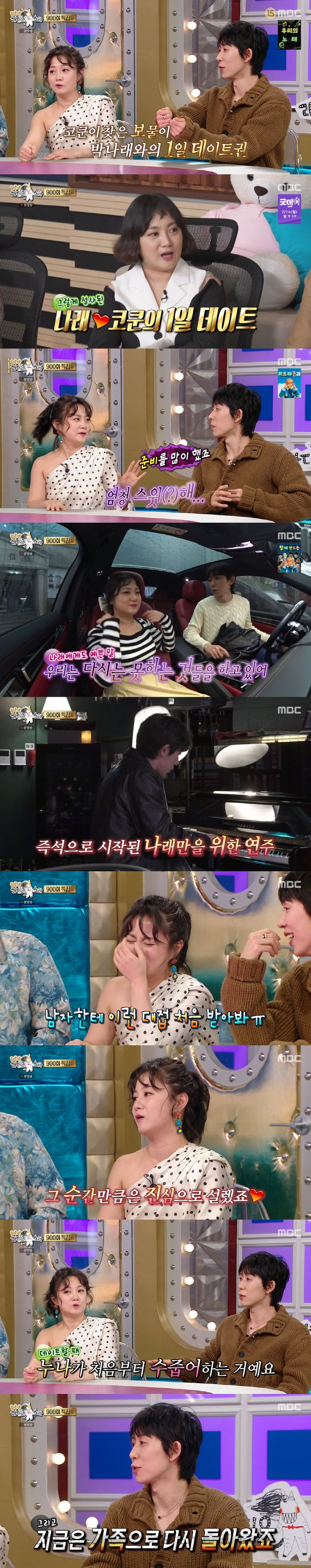 그렇게 성사된 박나래와 코드 쿤스트의 1일 데이트. 박나래는 "데이트를 했다. 코드 쿤스트가 엄청 스윗하고, 말을 진짜 예쁘게 잘한다"면서 "와인바에서 피아노 연주까지 해줬다. 그런 대접을 받아 본 적이 없다. 갑자기 오열했다"고 떠올렸다.