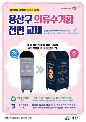 이를 해결하기 위해 구는 의류 수거함의 재활용 효율을 높이고, 체계적인 관리가 가능하도록 의류수거함 관리 단체인 대한민국 고엽제전우회 용산구지회와 서울지체장애인 용산구지회와 업무협약(MOU)을 체결했다. 이번 사업은 의류 수거함 관리단체의 제안으로 추진됐다.