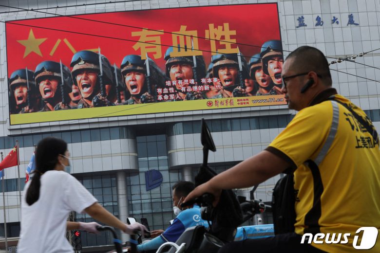 1일(현지시간) 중국 베이징의 인민해방군 창건 95주년 기념 스크린 앞으로 배달원들이 지나가고 있다. 매년 8월 1일은 중국 인민해방군의 건군 기념일이다. ⓒ 로이터=뉴스1 ⓒ News1 김예원 기자