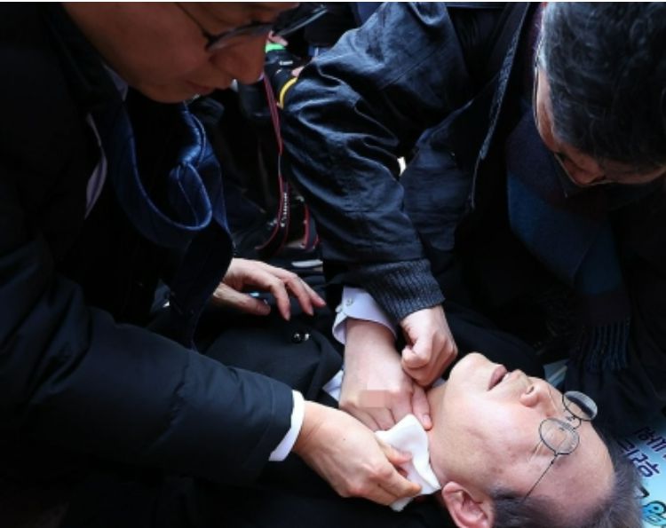 2024년 1월 더불어민주당 이재명 대표가 습격을 당해 바닥에 쓰러져 있다. 연합뉴스