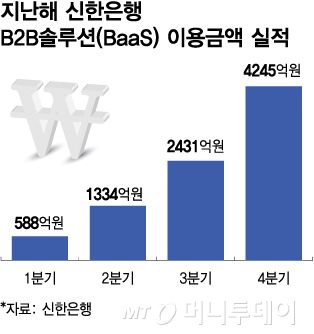 13일 금융권에 따르면 신한은행의 지난해 Baas 누적 이용금액은 4245억원으로 전년 말 대비 622% 성장했다. BaaS는 은행이 기업에게 금융 서비스나 인프라를 제공하는 사업이다. 종전 기업들이 사용하는 내부거래시스템에 은행의 서비스를 API(응용프로그램 인터페이스) 형태로 제공된다. 기업들은 종전에 사용하던 시스템 안에 새로 생긴 버튼만 한 번 클릭하면 다양한 금융 서비스를 받을 수 있다.