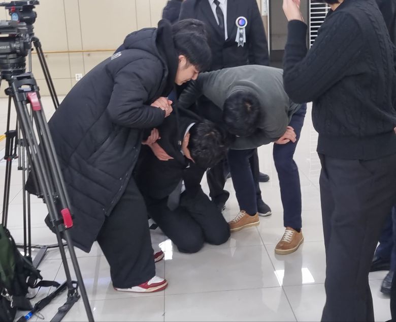 지난 10일 다니던 학교에서 교사에게 피살된 김하늘(8)양의 입관식이 13일 오전 대전 건양대병원 장례식장에서 진행됐다. 김양 아버지(가운데)가 입관 후 슬픔을 주체하지 못하고 주저앉아 오열하고 있다. /우정식 기자