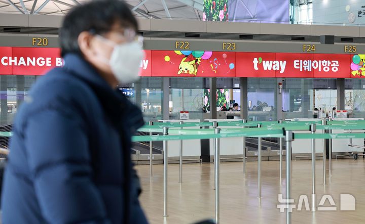 [인천공항=뉴시스] 고범준 기자 = 대명소노그룹이 티웨이항공 경영 참여를 공식화 한 가운데, 에어프레미아의 경영권 확보에도 적극 나설 것으로 보이는 22일 인천국제공항 제1여객터미널 티웨이 체크인 카운터가 보이고 있다. 국내·아시아 등 중단거리 노선과 유럽·미주까지 아우르는 장거리 노선을 모두 확보해 항공 산업에 본격 진출한다는 계획이다. 2025.01.22. bjko@newsis.com