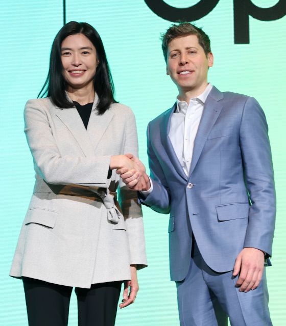 정신아 카카오 대표와 챗GPT 개발사인 오픈AI의 샘 올트먼 최고경영자(CEO)가 지난 4일 서울 중구 더플라자호텔에서 열린 기자간담회에서 전략적 제휴 체결 소식을 발표하며 악수를 하고 있다.  뉴스1