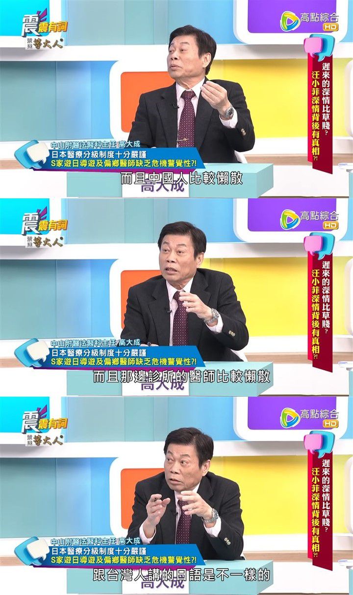 고대청은 "(중국 가이드는) 단순히 안내만 해주면 된다고 생각한다"며 "중국인이 말하는 일본어와 대만인이 말하는 일본어는 다르다. 중국인의 일본어는 억양이 강하고 권설음(혀를 말아 올리는 발음)이 포함돼 있어 일본인들이 이해하기 어려울 수 있다. 반면, 대만인이 말하는 일본어는 일본인들이 더 잘 이해할 수 있다"고 설명했다. 이는 중국 가이드의 태도와 발음 차로 병을 키웠다는 지적이다.