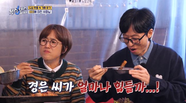 송은이는 "그냥 먹어"라며 "(유재석의 배우자인 나)경은 씨가 얼마나 힘들까"라고 말해 웃음을 안겼다. 유재석은 “경은 씨가 TV보면서 ‘언니 맞아요’라고 할 거다”라고 공감했다.