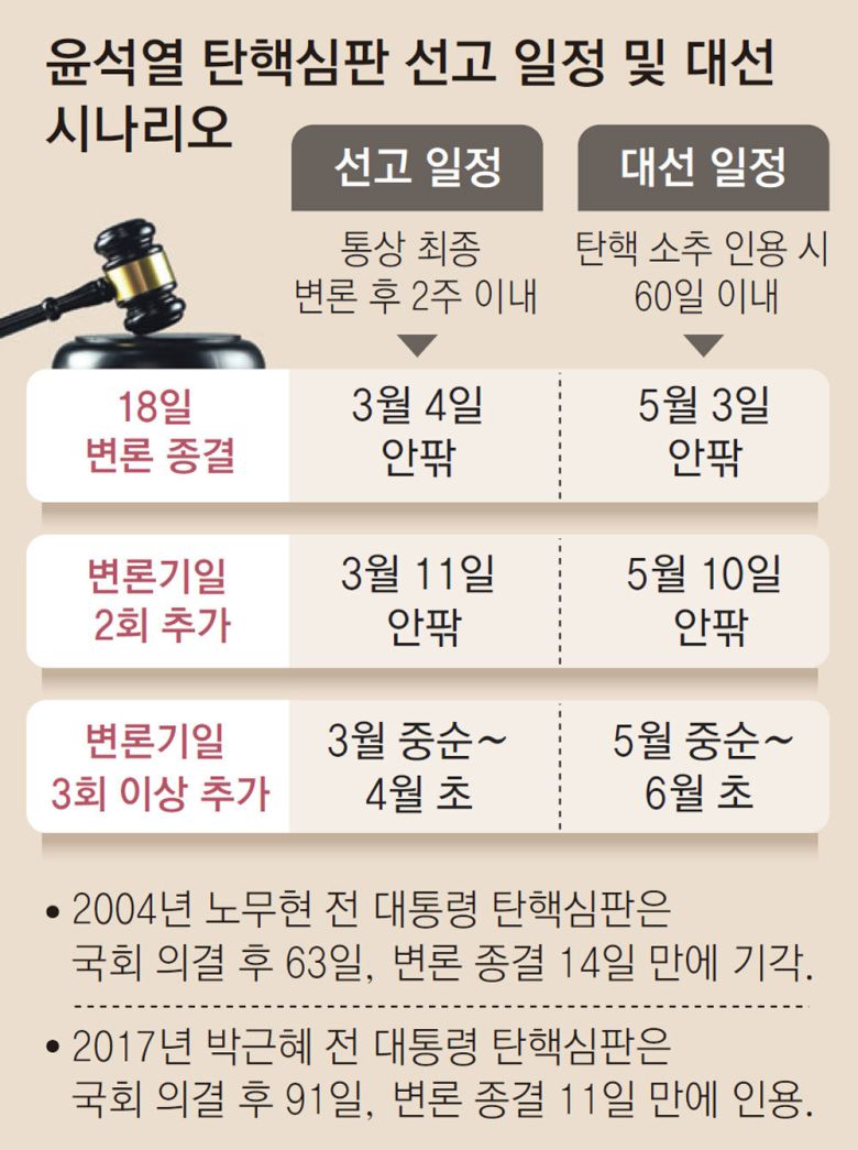 헌재가 증인을 추가 채택하지 않고, 18일 변론을 종결하면 2주 후인 3월 4일 안팎으로 선고가 진행될 거란 전망이 나온다. 헌법상 탄핵안 인용 시 60일 이내 대선을 치러야 하기 때문에 이 경우 대선은 5월 3일 안팎 ‘장미 대선’으로 치러질 것으로 보인다.