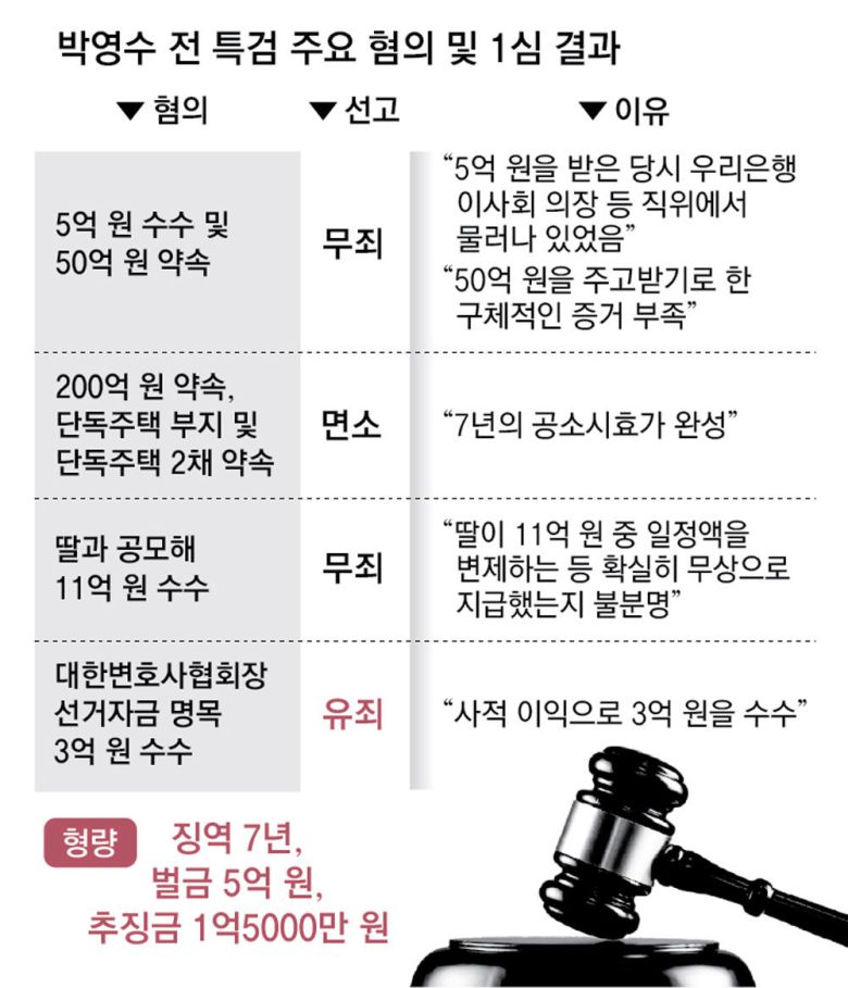 서울중앙지법 형사합의33부(부장판사 김동현)는 13일 특정경제범죄 가중처벌법 위반(수재 등) 혐의로 재판에 넘겨진 박 전 특검에게 “청렴함을 바탕으로 한 공정한 직무 집행이 매우 강하게 요구되는 지위에 있었다. 비난 가능성이 크고 엄벌이 필요하다”며 이같이 선고했다.