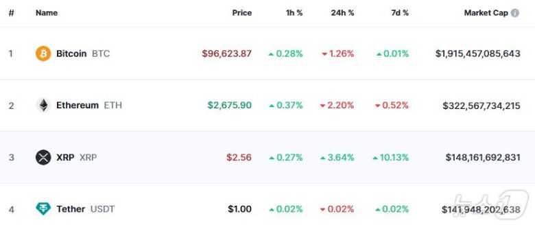 14일 오전 9시 현재 글로벌 코인 시황 중계사이트인 코인마켓캡에서 비트코인은 24시간 전보다 1.26% 하락한 9만6623달러를 기록하고 있다.