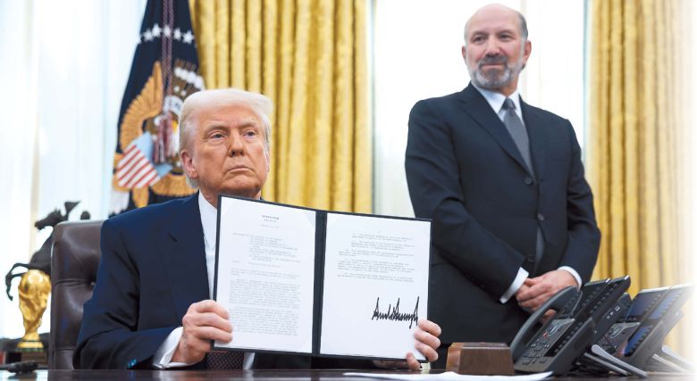 도널드 트럼프 미국 대통령이 13일(현지시간) 미 워싱턴 D.C.에 있는 백악관 집무실에서 상호관세를 세계 각국에 부과하는 대통령 각서에 서명한 뒤 이를 들어보이고 있다. 그는 해왔던 말대로 “관세는 좋은 것이다, 사실 아주 훌륭하다”라고 다시 한번 말했다. 주무 부처인 상무부의 하워드 러트닉 장관 지명자가 곁에서 손을 모은 채 대기하고 있다. [UPI]