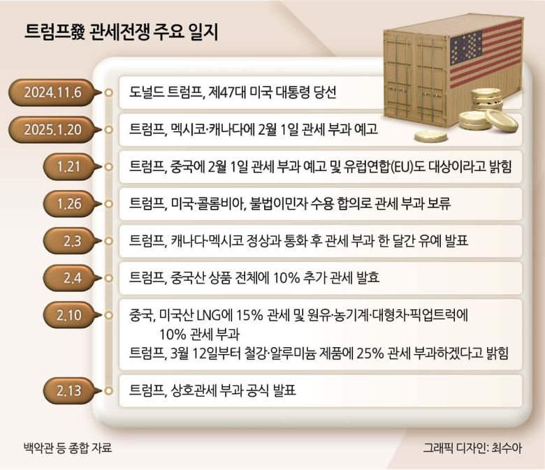 트럼프 대통령이 취임 한 달도 안 돼 이처럼 관세를 통한 퇴로 없는 무역전쟁 강행하는 것은 미국의 엄청난 규모의 무역 적자 해소를 위한 것으로 풀이된다. 또 관세 징수를 통해 천문학적 규모의 국가 부채를 축소하는 동시에 감세 공약을 위한 재원을 마련하고, 외국 기업들의 미국 내 투자를 유도해 미국 제조업의 부흥을 꾀하려는 포석으로도 해석된다.