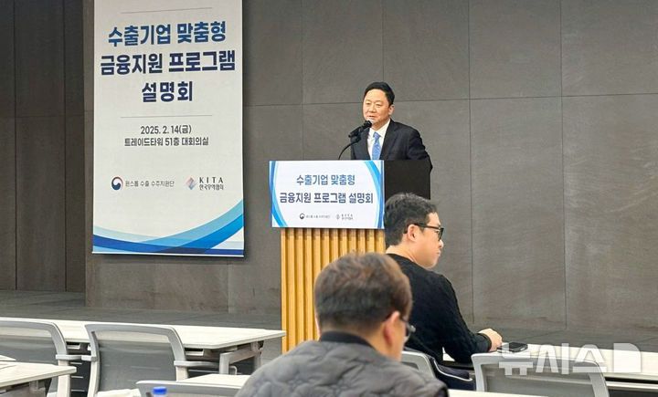[세종=뉴시스] 김동준 기획재정부 원스톱 수출·수주지원단 부단장이 14일 오전 서울 강남구 트레이드타워에서 열린 '수출금융 지원 프로그램 설명회'에서 발언하고 있다. (사진=기재부 제공) 2025.02.14. photo@newsis.com