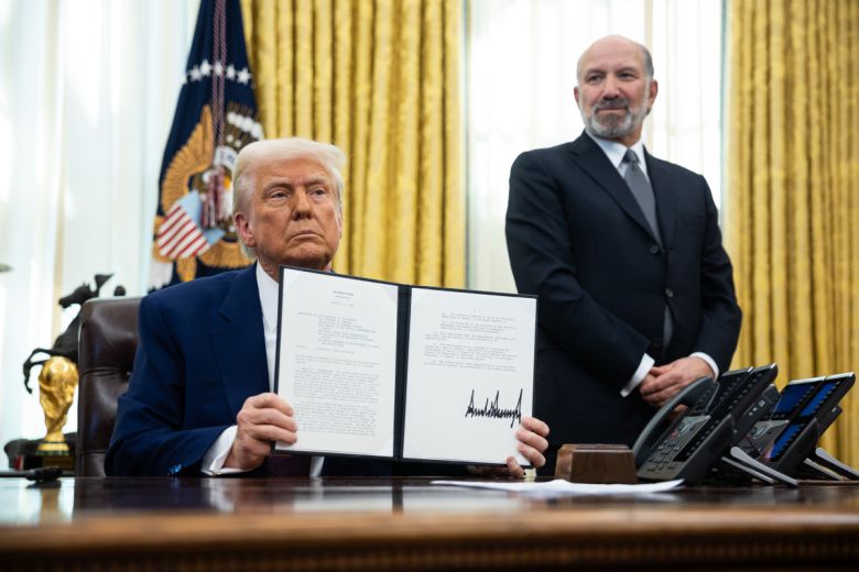 도널드 트럼프 미국 대통령이 13일(현지시간)백악관 집무실에서 하워드 러트닉 상무장관 지명자 옆에 서 있는 가운데 상호관세에 관한 대통령 각서에 서명한 후 들어보이고 있다. 그는 "관세는 좋다, 사실 관세는 훌륭하다"고 말했다. 워싱턴D.C.(미국)/UPI연합뉴스