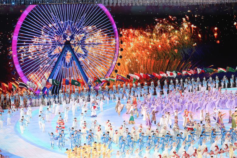 7일 중국 하얼빈 국제 컨벤션 전시 스포츠센터에서 열린 하얼빈 동계 아시안게임 개회식에서 축하 공연이 펼쳐지고 있다.
