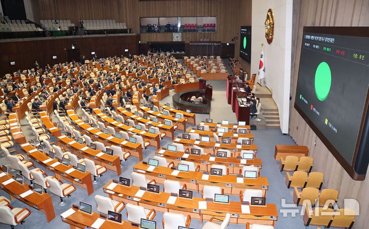 [서울=뉴시스] 권창회 기자 =  14일 오후 서울 여의도 국회에서 열린 제422회 국회(임시회) 제6차 본회의에서 헌법재판소 재판관 마은혁 임명 촉구 결의안이 가결되고 있다. 2025.02.14. kch0523@newsis.com