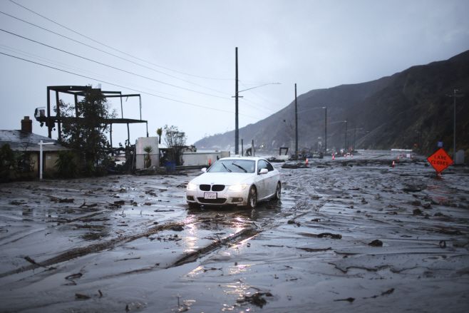 13일(현지시간) 미국 캘리포니아주 말리부에 있는 태평양 해안 고속도로에서 한 차량이 진흙에 막혀 정차돼 있다. 이곳은 최근 발생한 팰리세이즈 화재 피해를 입은 지역이다./AP 연합