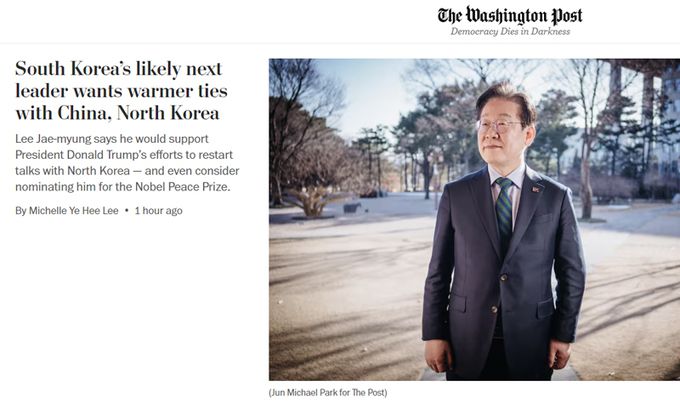 WP는 14일(현지시간) ‘한국 차기 가능성있는 지도자는 중국, 북한과 관계개선 원해(South Korea’s likely next leader wants warmer ties with China, North Korea)’ 제하의 보도에서 이 대표가 북·미대화를 지원하고 돌파구가 마련될 경우 노벨평화상 추천을 고려할 것이라며 “이는 현재 한국의 대북 강경책에서 급격한 변화를 예고하는 것”이라고 보도했다.