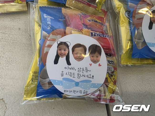 특히 포장지 겉면에는 아이들의 사진과 함께 ‘아빠, 삼촌들 올 시즌도 힘내세요!’라는 응원 문구가 담긴 스티커가 부착돼 있어 눈길을 끌었다.