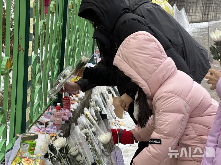 [대전=뉴시스] 김도현 기자 = 12일 오후 초등학생 피살 사건이 발생한 대전 서구 관저동의 한 초등학교 정문 옆 담장에서 김하늘(7)양을 추모하는 아이와 부모가 꽃을 내려놓고 있다. 2025.02.12. kdh1917@newsis.com