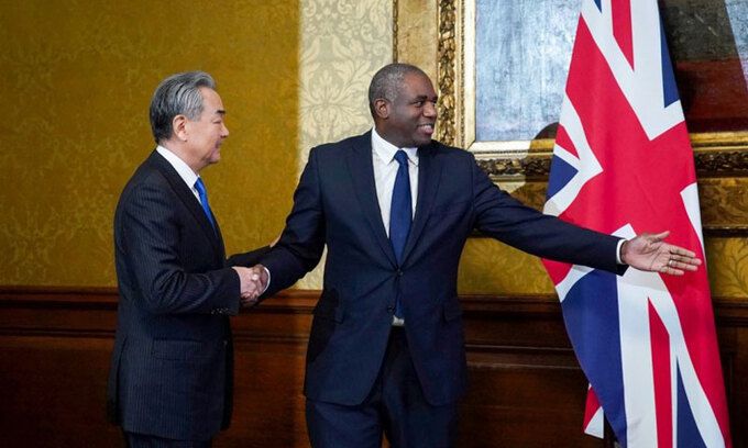 데이비드 래미(오른쪽) 영국 외무장관과 왕이 중국공산당 중앙외사판공실 주임 겸 외교부장이 13일(현지시간) 런던에서 만나고 있다. 로이터연합뉴스 |