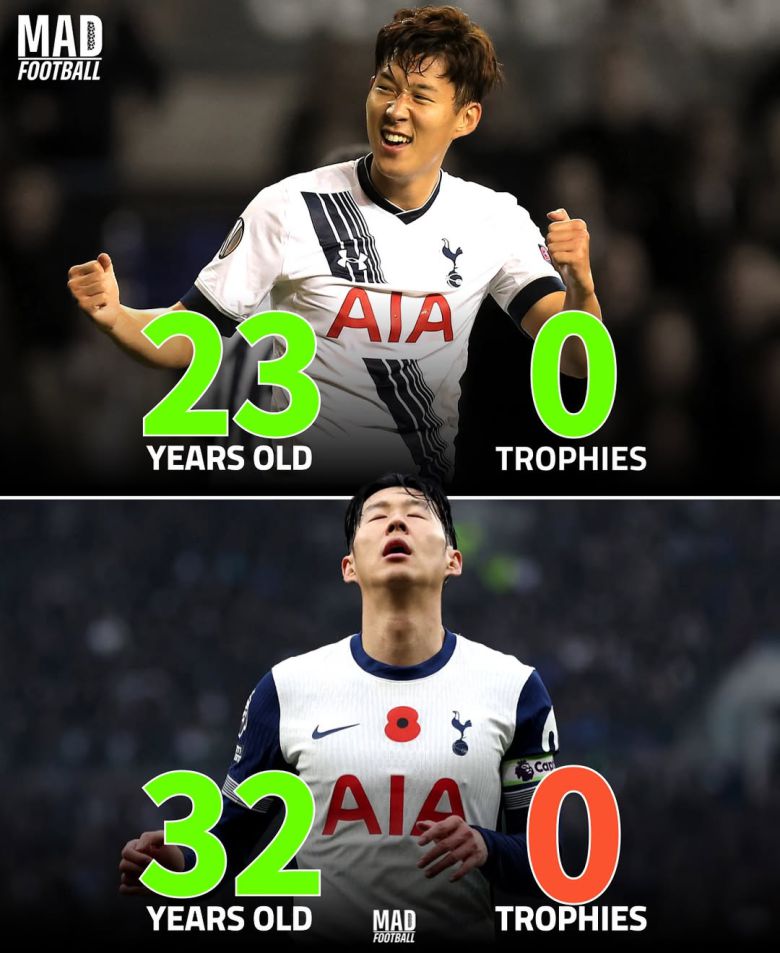 축구 컨텐츠 제작소 매드풋볼도 SNS를 통해 토트넘 입단 당시 23세였던 손흥민이 트로피가 없었으나 32세가 된 지금까지도 여전히 트로피가 0개라는 사진을 만들어 게시할 정도다. 손흥민이 토트넘을 '노 트로피'로 떠날 가능성이 높아진 상태다.