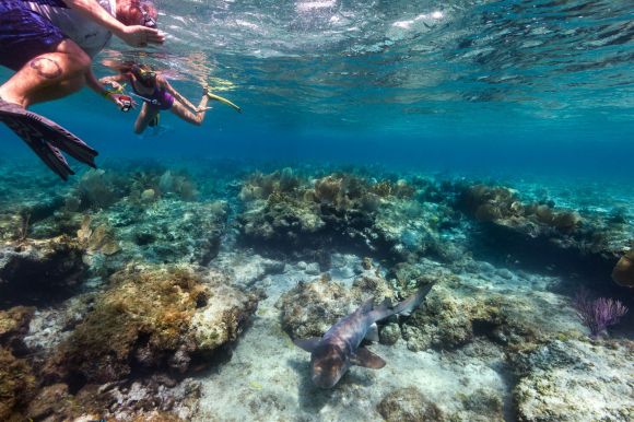 터크스 케이커스 제도 프로비던셜스 섬 앞바다에서 관광객이 수염상어와 스노클링 하는 모습. 터크스 케이커스 제도 관광청 홈페이지 캡처