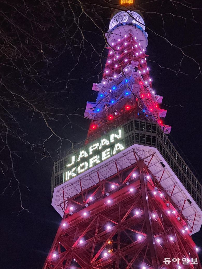 이날 오후 6시 도쿄 중심부 랜드마크인 도쿄타워에는 태극무늬 색깔인 파란색과 빨간색 조명이 불을 밝혔다. 일본 국기에 있는 색깔인 흰색과 빨간색 조명도 켜졌다. 도쿄타워 전망대 전광판에는 한일 양국 영어 국명인 저팬 코리아(JAPAN KOREA) 글씨도 새겨졌다.