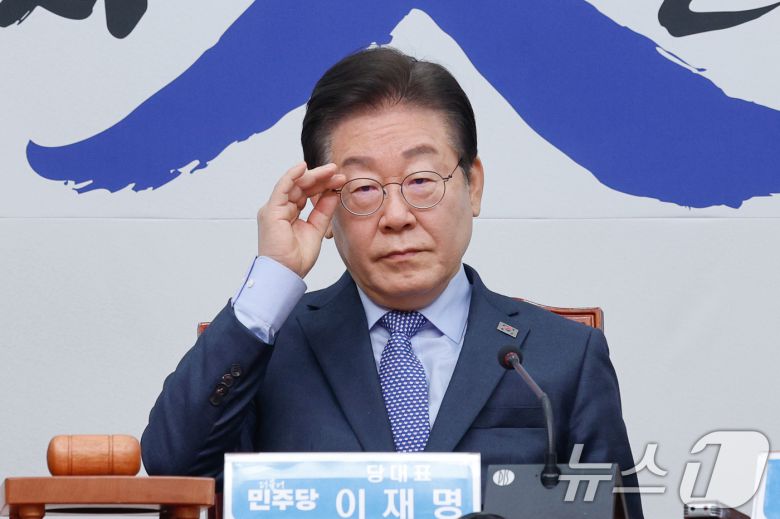 이재명 더불어민주당 대표가 14일 오전 서울 여의도 국회에서 열린 최고위원회의에 참석해 안경을 고쳐쓰고 있다. 2025.2.14/뉴스1 ⓒ News1 안은나 기자 |
