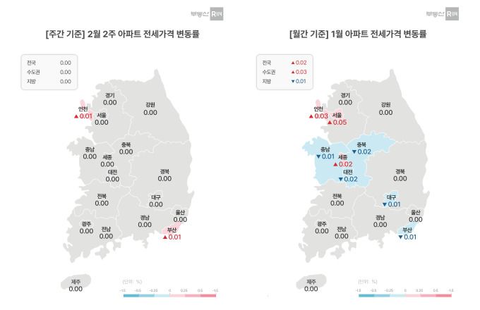 16일 부동산R114에 따르면 2월 둘째 주 전국 아파트 매매가격은 전주 대비 0.01% 상승했다. 전국 17개 시·도 중 상승 지역은 9곳, 보합 1곳, 하락 7곳으로 상승 지역이 우세했다.