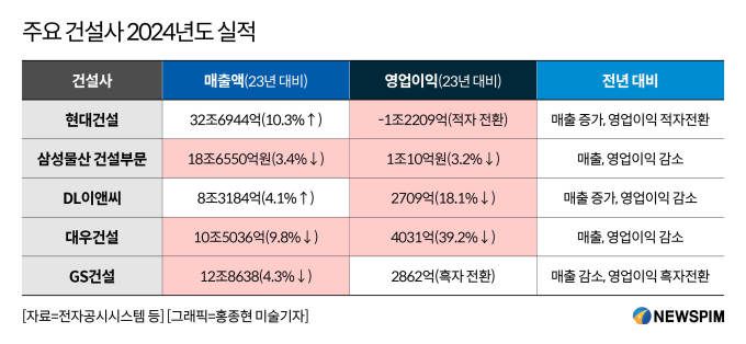 업계 맏형 격인 현대건설은 32조6944억(전년 대비 10.3% 증가)의 매출을 기록했음에도 1조원대의 적자를 보고했다. 2001년 이후 23년 만에 적자로, 자회사 현대 엔지니어링의 해외 프로젝트 대규모 손실을 반영한 결과라는 것이 사측의 설명이다.