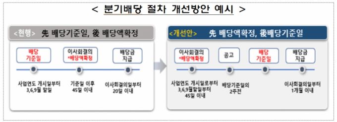 앞서 정부는 상법 유권해석 및 기업별 정관개정을 통해 주주총회 의결권기준일과 배당기준일을 분리하고 배당기준일을 주총 이후로 지정하도록 했다. 이에 따라 올해부터 분기 배당 시에도 이사회 결의로 배당액을 확정한 이후 배당받을 주주를 결정할 수 있다.