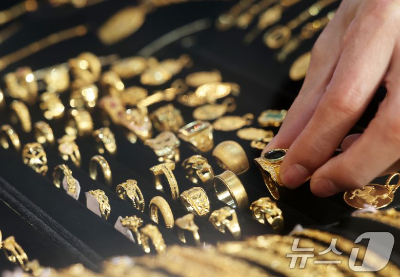 (서울=뉴스1) 오대일 기자 = 금 현물시장 'KRX 금시장'의 시장가가 국제 금 시세보다 비싼 상태가 계속되는 등 금 투자 수요가 폭증하는 가운데 16일 서울 종로구의 한 귀금속도매상점에서 직원이 금 제품을 정리하고 있다. 15일 금융투자업계에 따르면 전날 오후 1시께 한국거래소 KRX금시장에서 1㎏짜리 금 현물(금 99.99_1㎏) 1g은 16만8천200원으로 전 거래일 대비 3.8%가량 오른 가격에 거래됐다. 2025.2.16/뉴스1