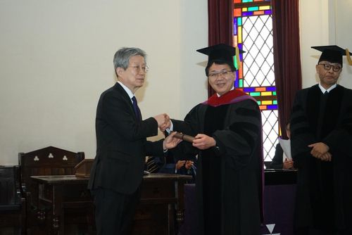 도시샤대, 시인 윤동주에 명예박사 학위 수여   (도쿄=연합뉴스) 도시샤대가 16일 연 명예 박사학위 수여식에서 윤동주 시인의 조카 윤인석 성균관대 명예교수(왼쪽)와 고하라 가쓰히로 총장이 악수하는 모습. 2025.2.16. [주오사카총영사관 제공]