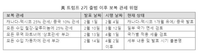 지난달 20일(현지시간) 취임한 트럼프는 이달 1일 마약성 진통제 '펜타닐' 통제를 이유로 멕시코·캐나다·중국에 10~25%의 보복관세를 지시했다. 그는 지난 10일에는 미국에 수입하는 모든 철강·알루미늄 제품에 25%의 관세를 추가한다고 밝혔다. 13일에는 외국이 미국 제품에 부과하는 관세를 따져 이에 상응하는 '상호관세'를 부과한다고 알렸으며, 14일에는 수입 자동차에 새로운 관세를 도입한다고 예고했다. 그는 취임 전 대선 공약으로 해외 모든 수입품에 10~20%의 '보편관세'를 추가한다고 주장했으나 아직 이에 대해 언급하지는 않았다.