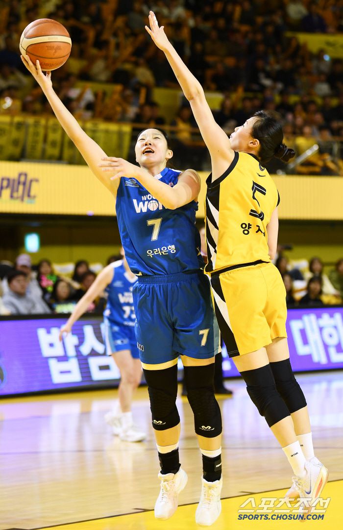 16일 청주체육관에서 열린 여자프로농구 KB스타즈와 우리은행의 경기. 우리은행 이민지가 KB스타즈 양지수를 제치며 레이업슛을 시도하고 있다. 인천=정재근 기자 cjg@sportschosun.com/2025.2.16/