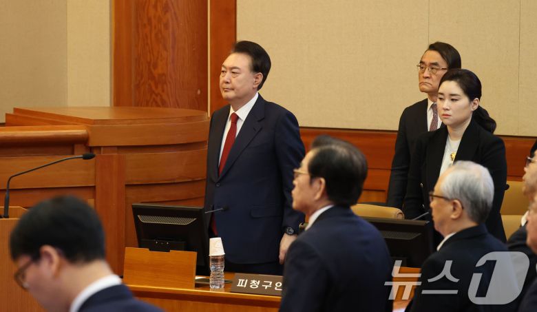 윤석열 대통령이 13일 서울 종로구 헌법재판소에서 열리는 탄핵심판 8차 변론에 출석해 헌법재판관들 입장에 맞춰 기립해 있다. 2025.2.13/뉴스1 ⓒ News1 사진공동취재단